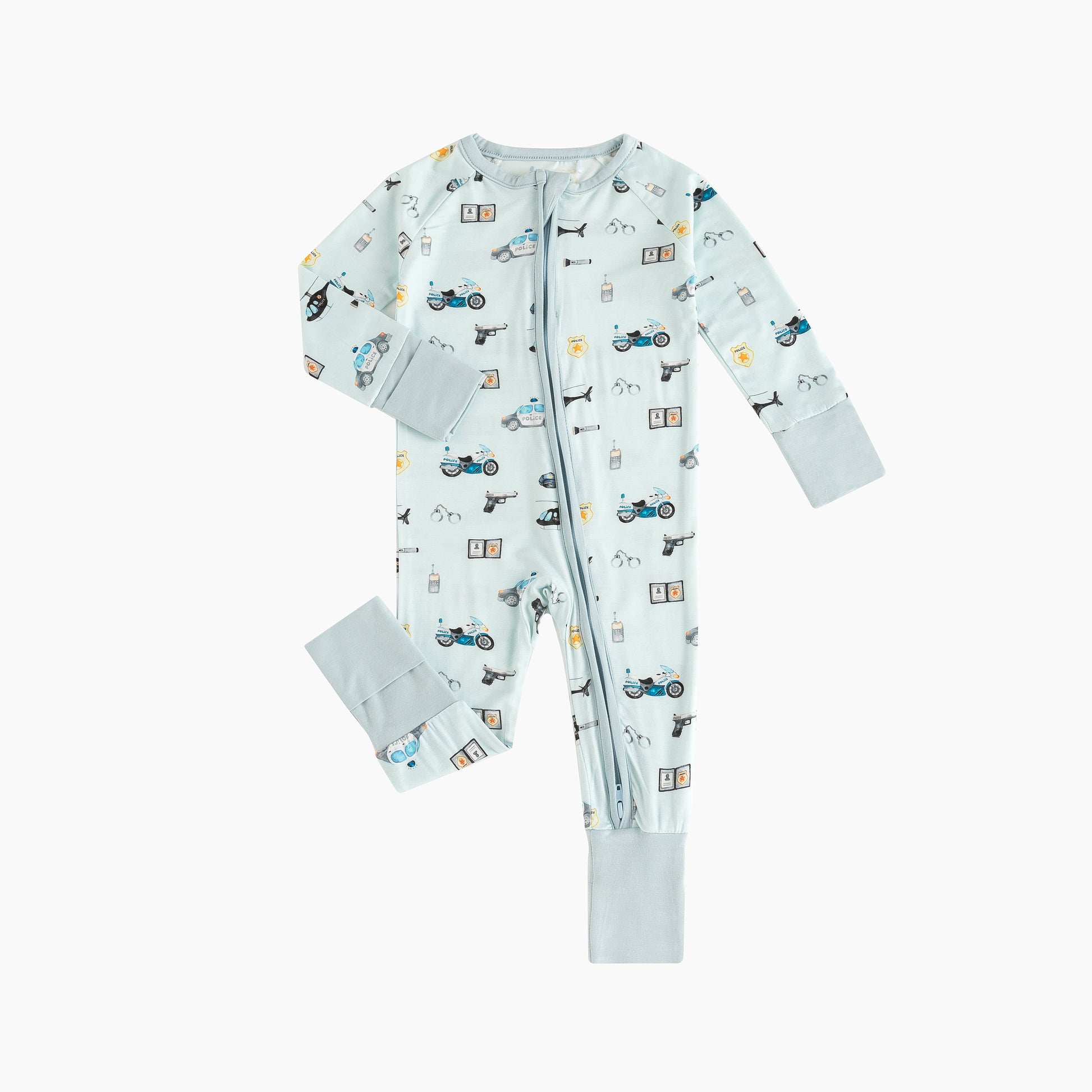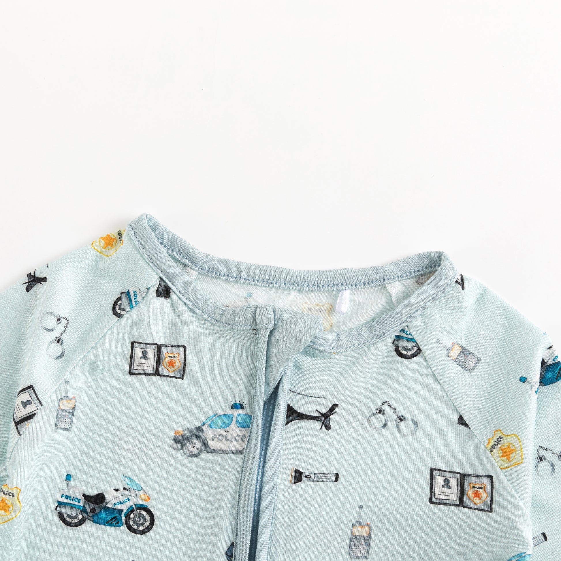 Light Blue Cartoon Police Print Baby Bamboo Zip-Up Romper