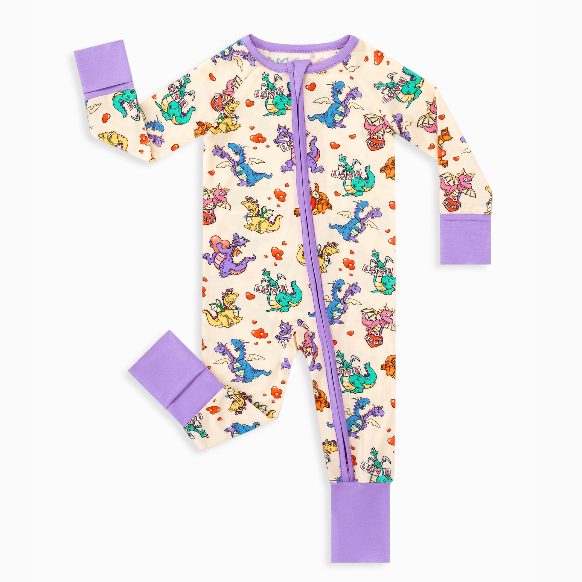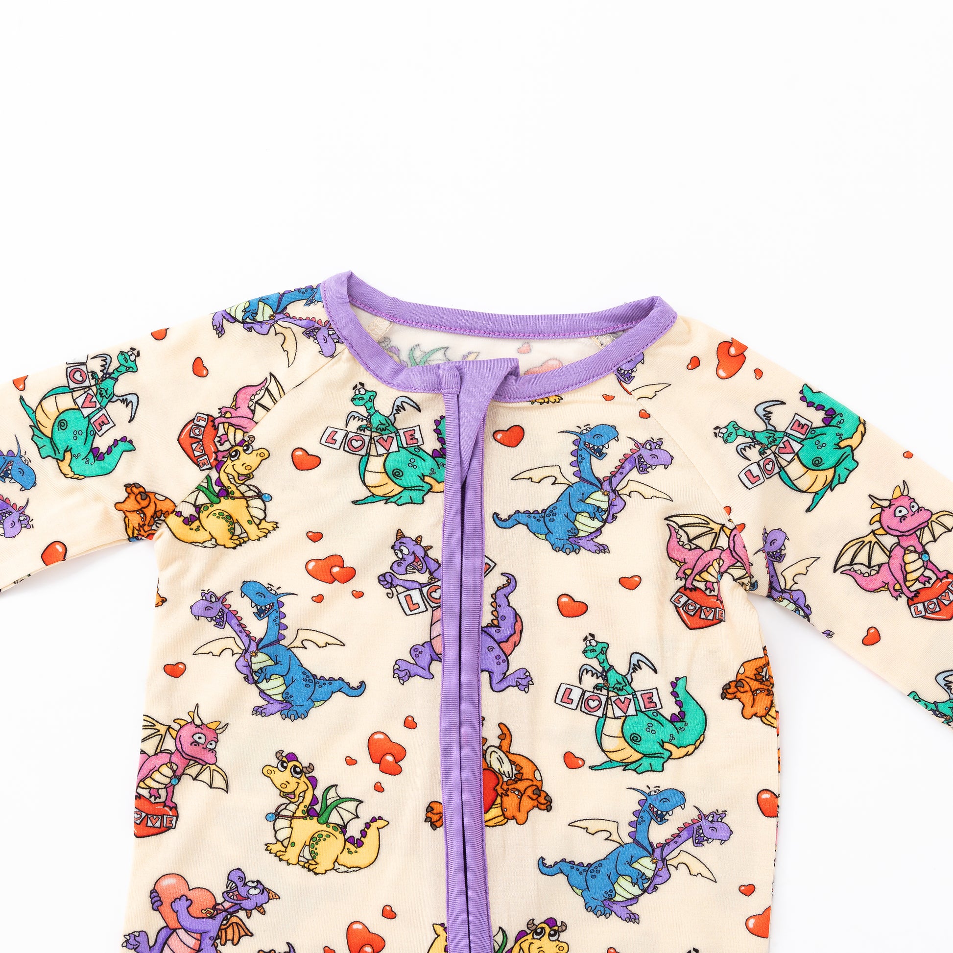 Valentine Dino Love Adventure and Hearts Bamboo Zipper Romper Pajamas