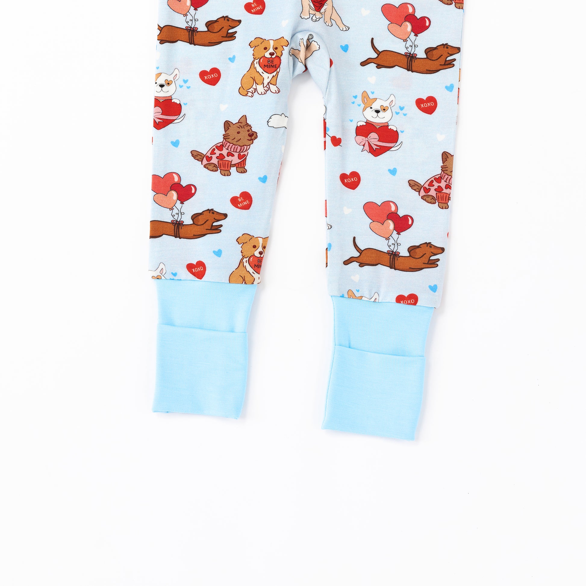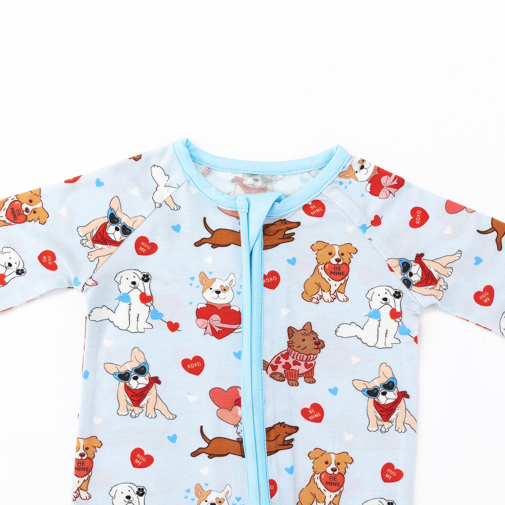 Valentine Heart Puppy Cuddle Crew Blue Bamboo Zipper Romper Pajamas