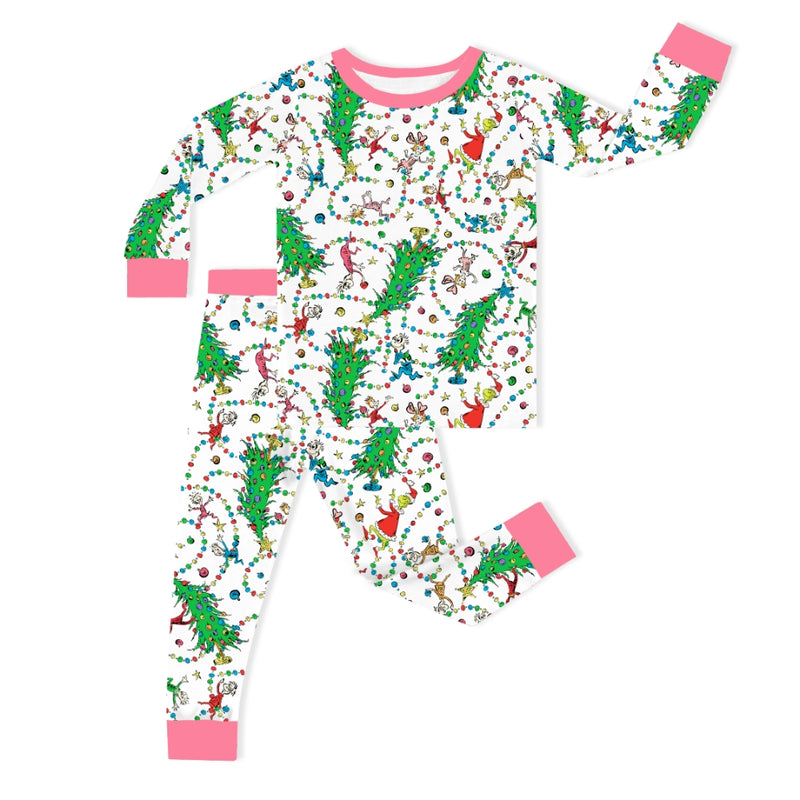 Christmas Tree Light Green Face Kids Bamboo Two-Piece Pajama Set