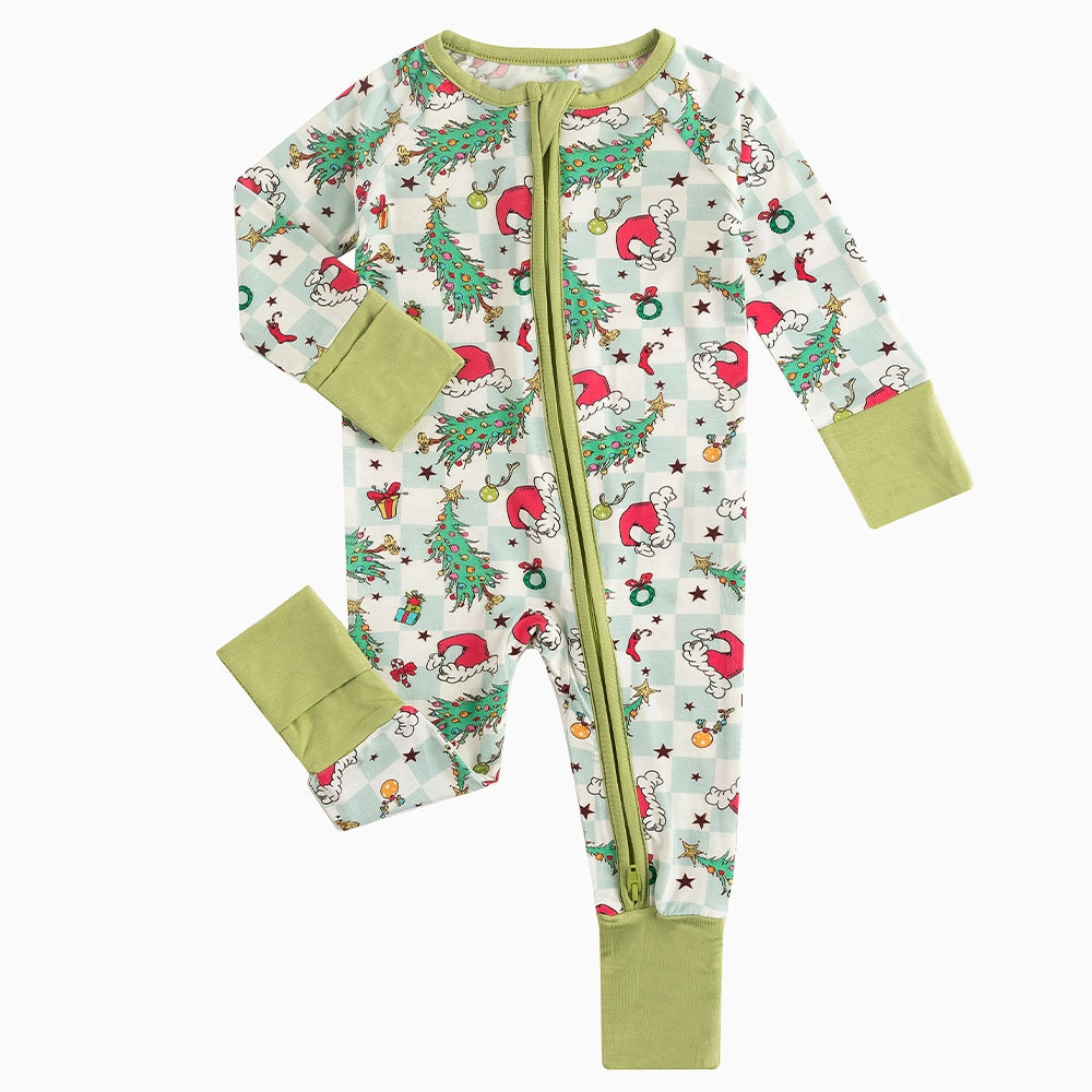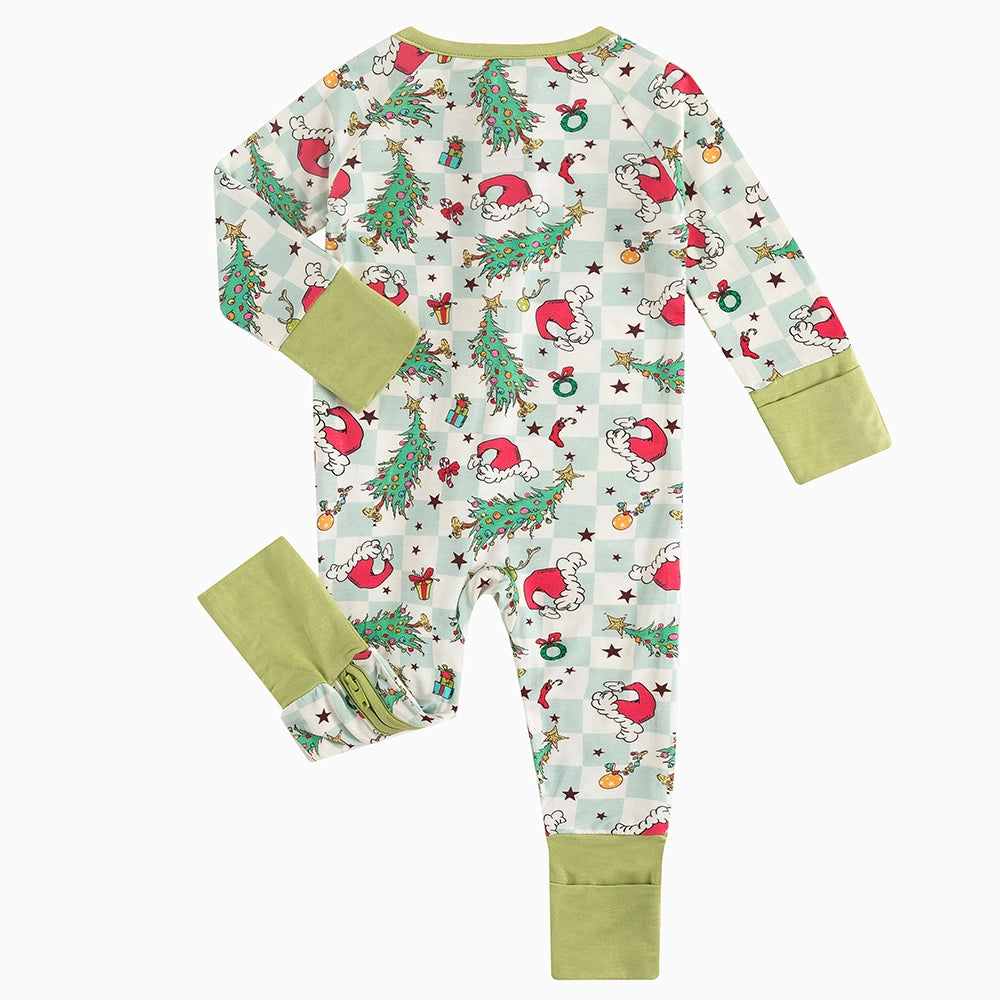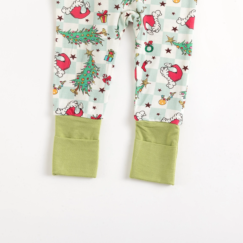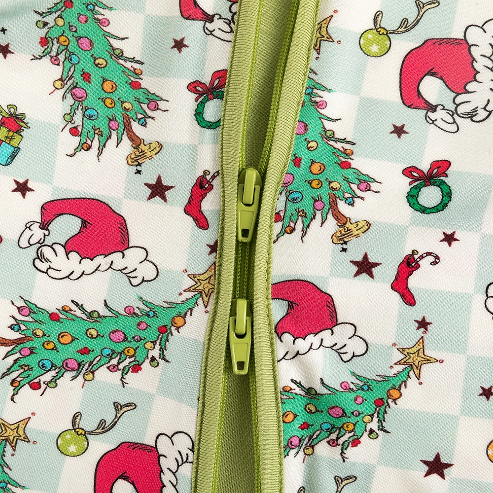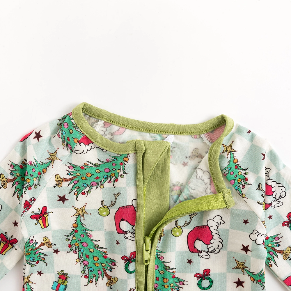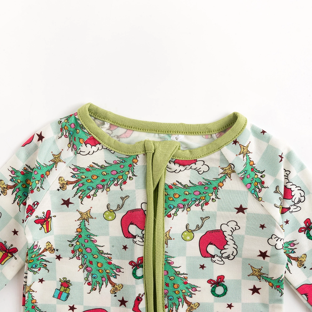 Christmas Tree Santa Hat Green Plaid Baby Bamboo Zipper Romper Pajamas
