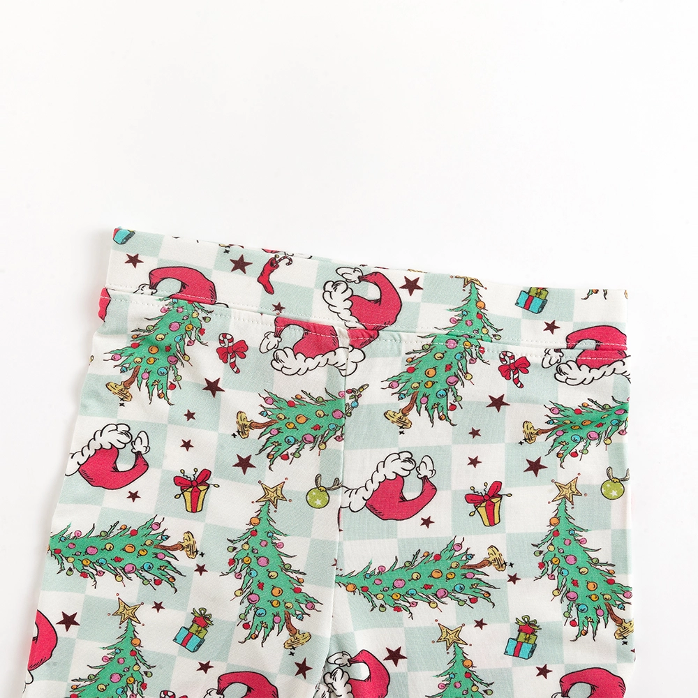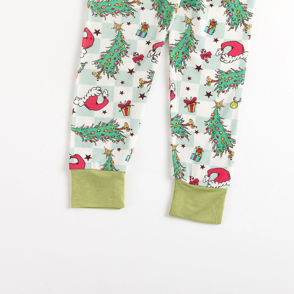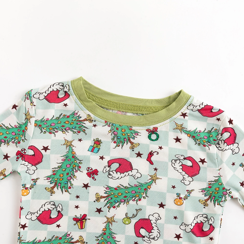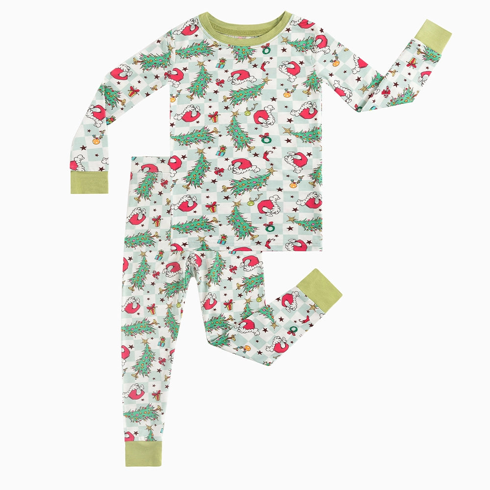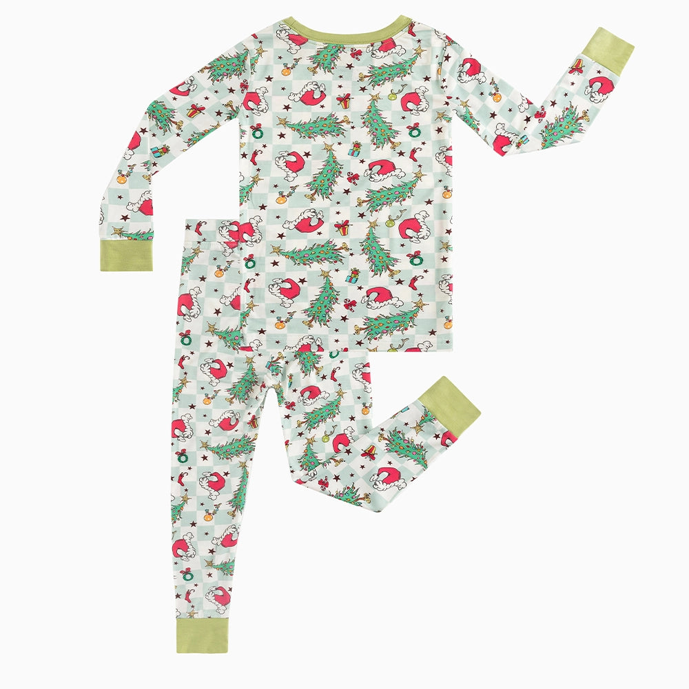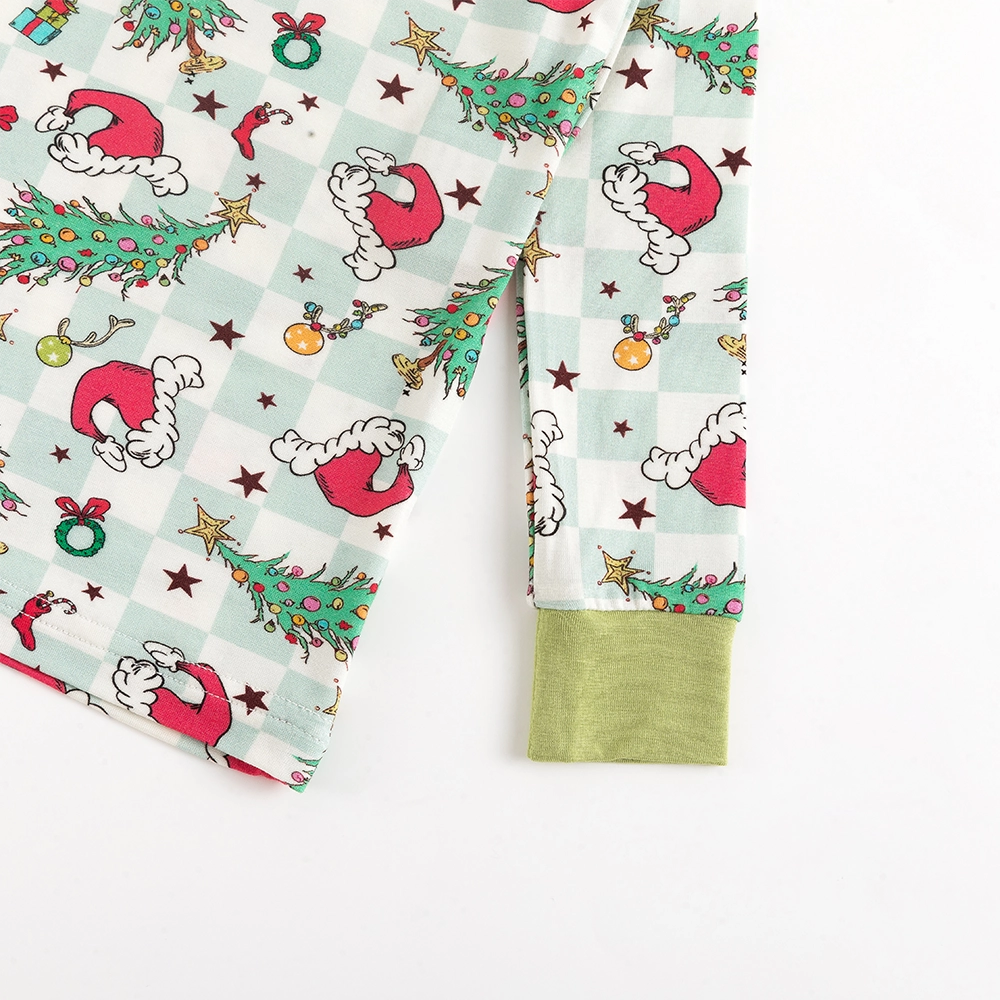 Christmas Tree Santa Hat Green Plaid Kid Bamboo Long Sleeve Pajama Set
