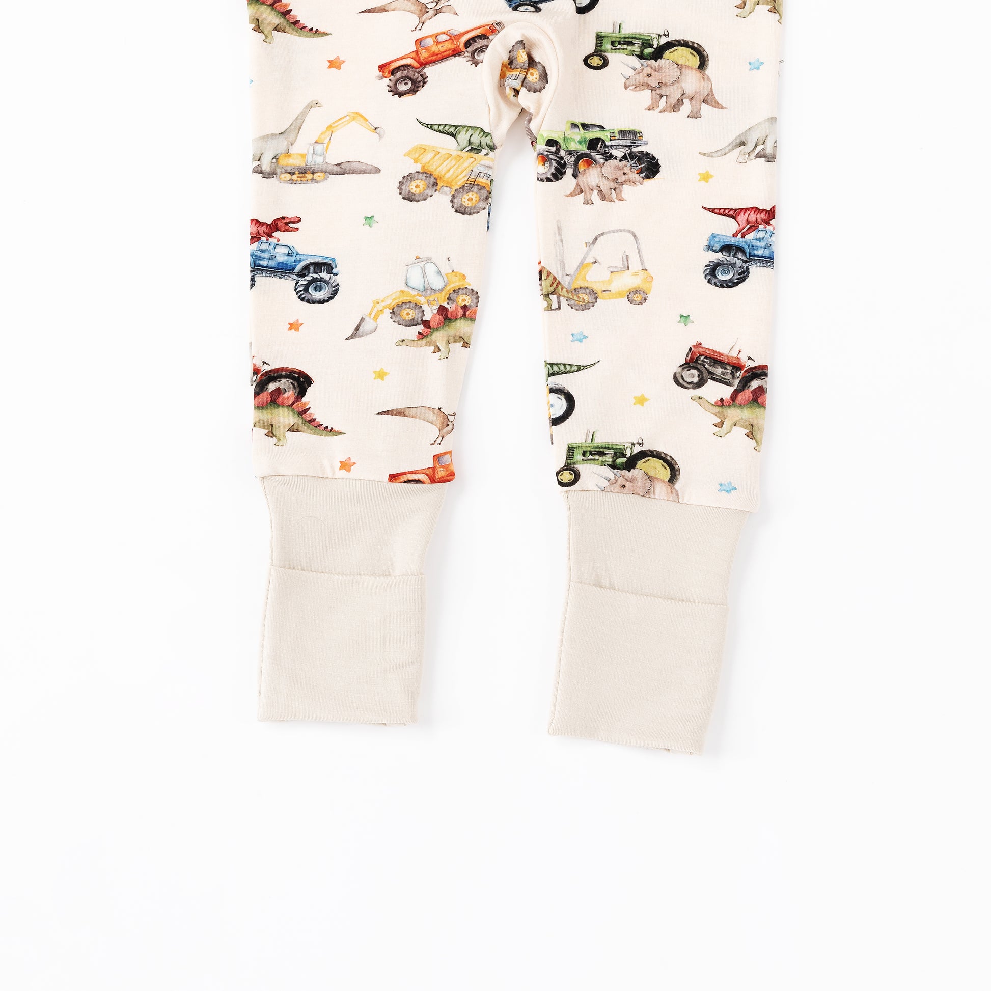 Dino Truck Adventure Ride and Stars Apricot Bamboo Zipper Romper Pajamas