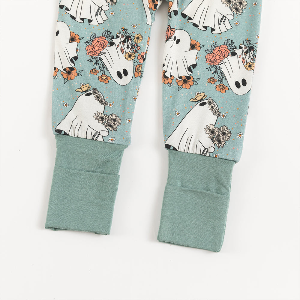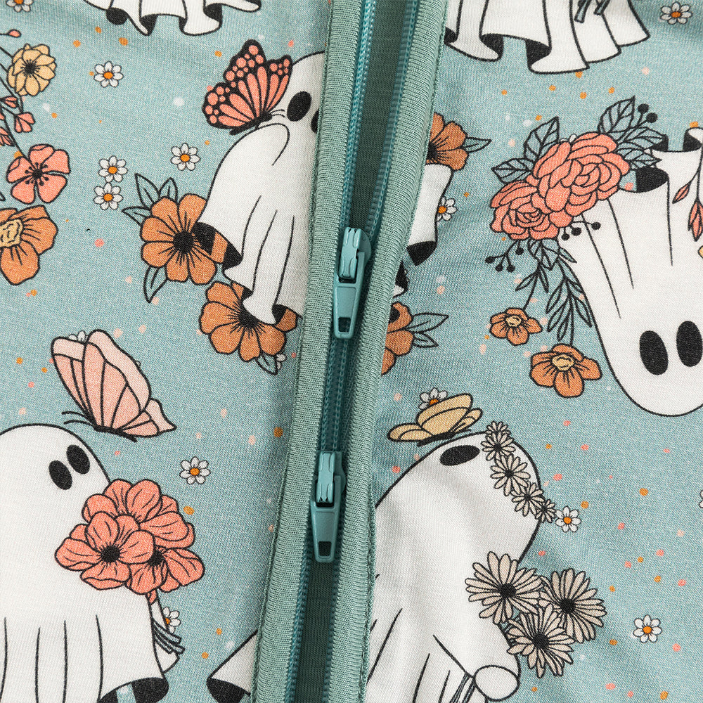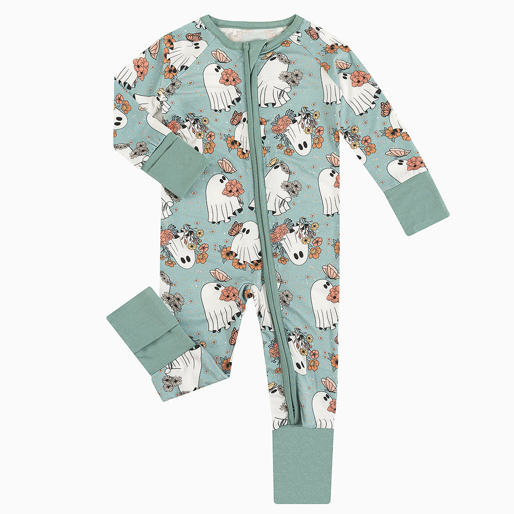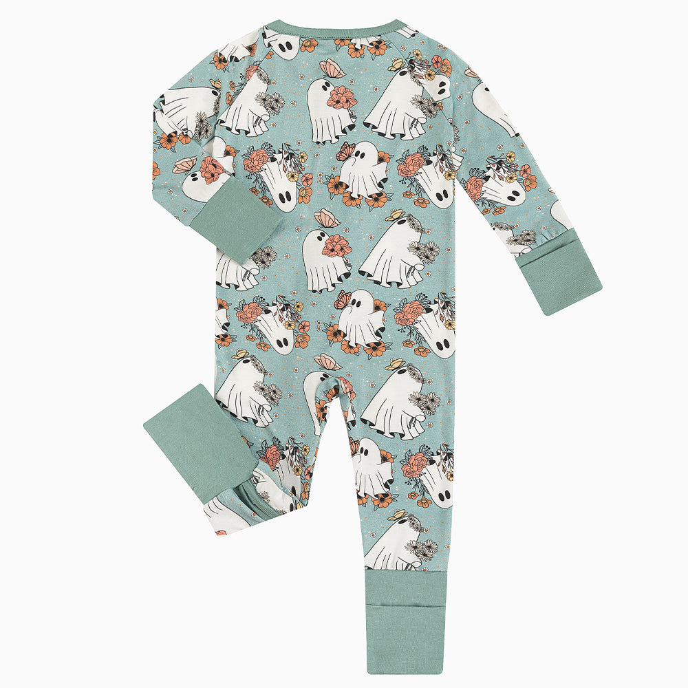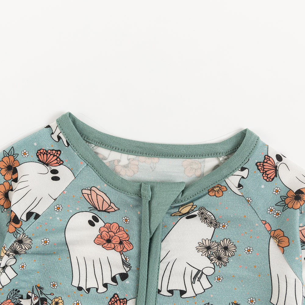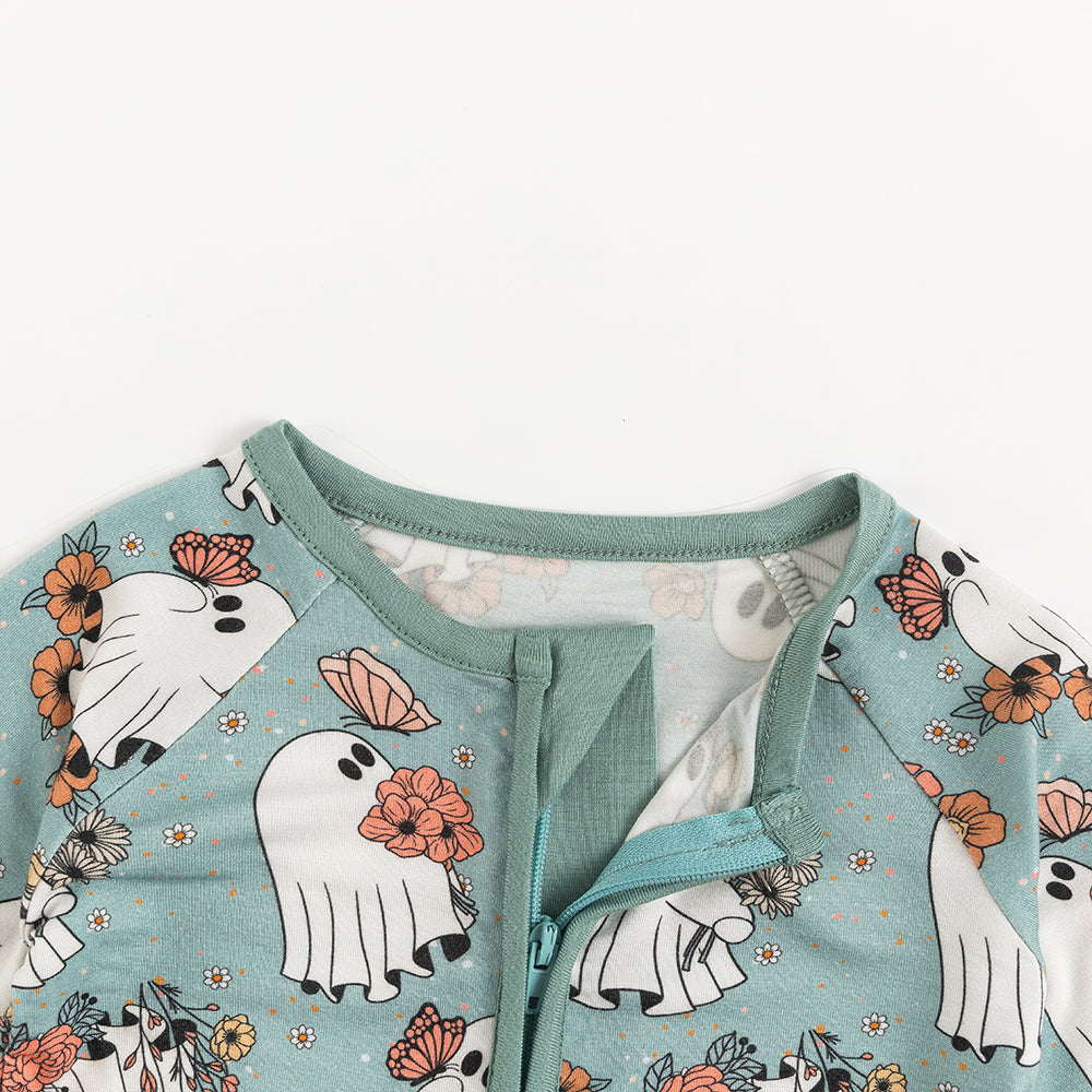 Halloween Green Ghost Flowers Baby Bamboo Zipper Romper Pajamas